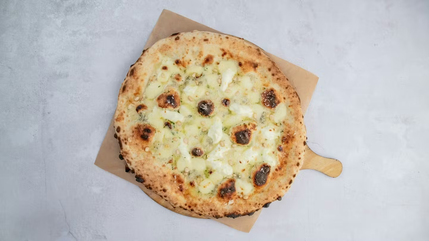 4 types of cheese, basil pesto , arugula , pini nuts Pizza packaging