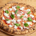 sos z pomidorów pelati, mozzarella di bufala, prosciutto crudo, mozzarella, bazylia