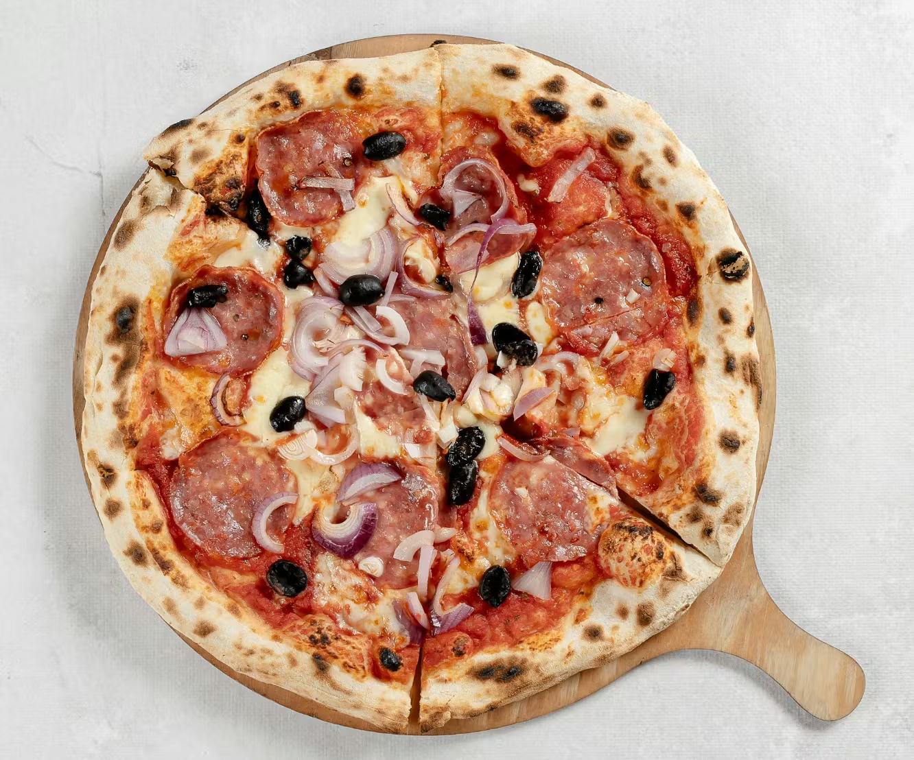 sos z pomidorów pelati, mozzarella, salame napoli, oliwki czarne, czerwona cebula