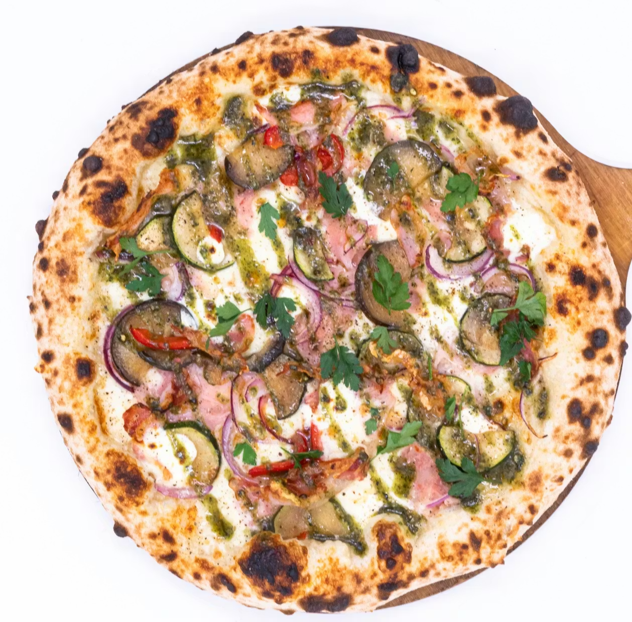 pesto bazyliowe, grillowane warzywa, mascarpone, mozzarella, grana padano, włoska szynka cotto, boczek pancetta, czerwona cebula, pieprz czarny, pietruszka, śmietanka